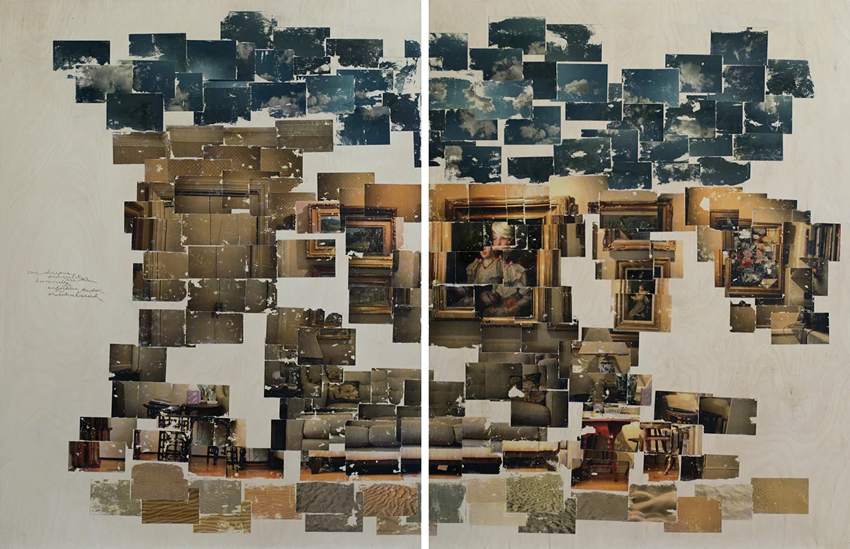 Multidisciplinary artist Cole Sternberg is an explorer of the human soul, the American psyche and the paranoia surrounding global growth, change and ecological destruction. Although he is predominantly a painter, Sternberg also practices sculpture, photography, film and room installations. At Paris Photo Los Angeles 2015, Sternberg will present what may be one of his most exciting photographic journeys yet: a recreation of his grandmother’s den from her home in Long Island. Sternberg has exhaustively documented every inch of the space and the strange objects that live there: "...Late 19th century plein air impressionist American painting, a 1990s TV with really strange, hardly decipherable instructions for how to use it, her VHS collection, my grandpa’s ashes, a binder about a Parisian tourist trip they did—this real weird mix of things—pillows knitted with puppies yawning." Through collage and unorthodox photographic processes, “My Grandma’s Den” is a microcosm of a larger consciousness: an America afraid of itself, afraid of its neighbors, armed to the teeth and begging for spiritual catharsis. After Paris Photo, Sternberg will be exhibiting a site-specific work in the Hamptons and then he is off to travel the world aboard a shipping vessel to create works that deal with human minuteness and global trade. In the following fascinating interview, Sternberg discusses his practice, the fate of mankind and his grandmother’s den.